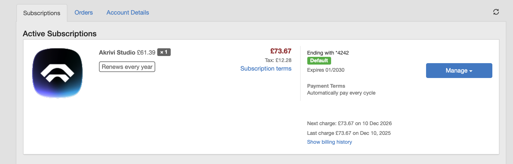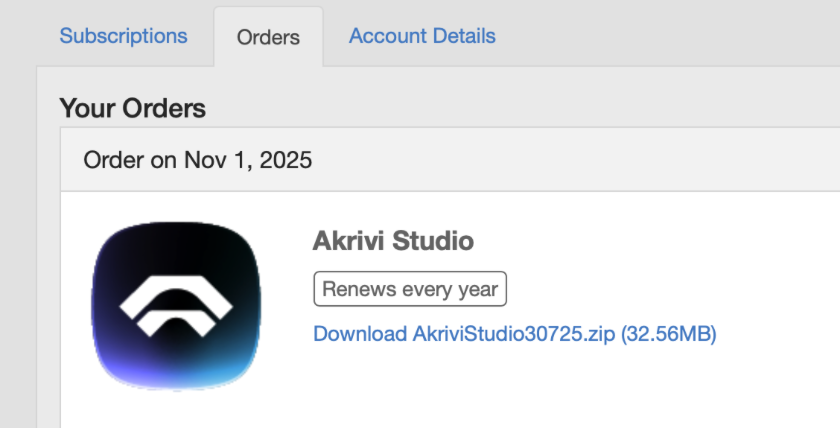 Go to the account sign-in page here: https://akrivi.onfastspring.com/account